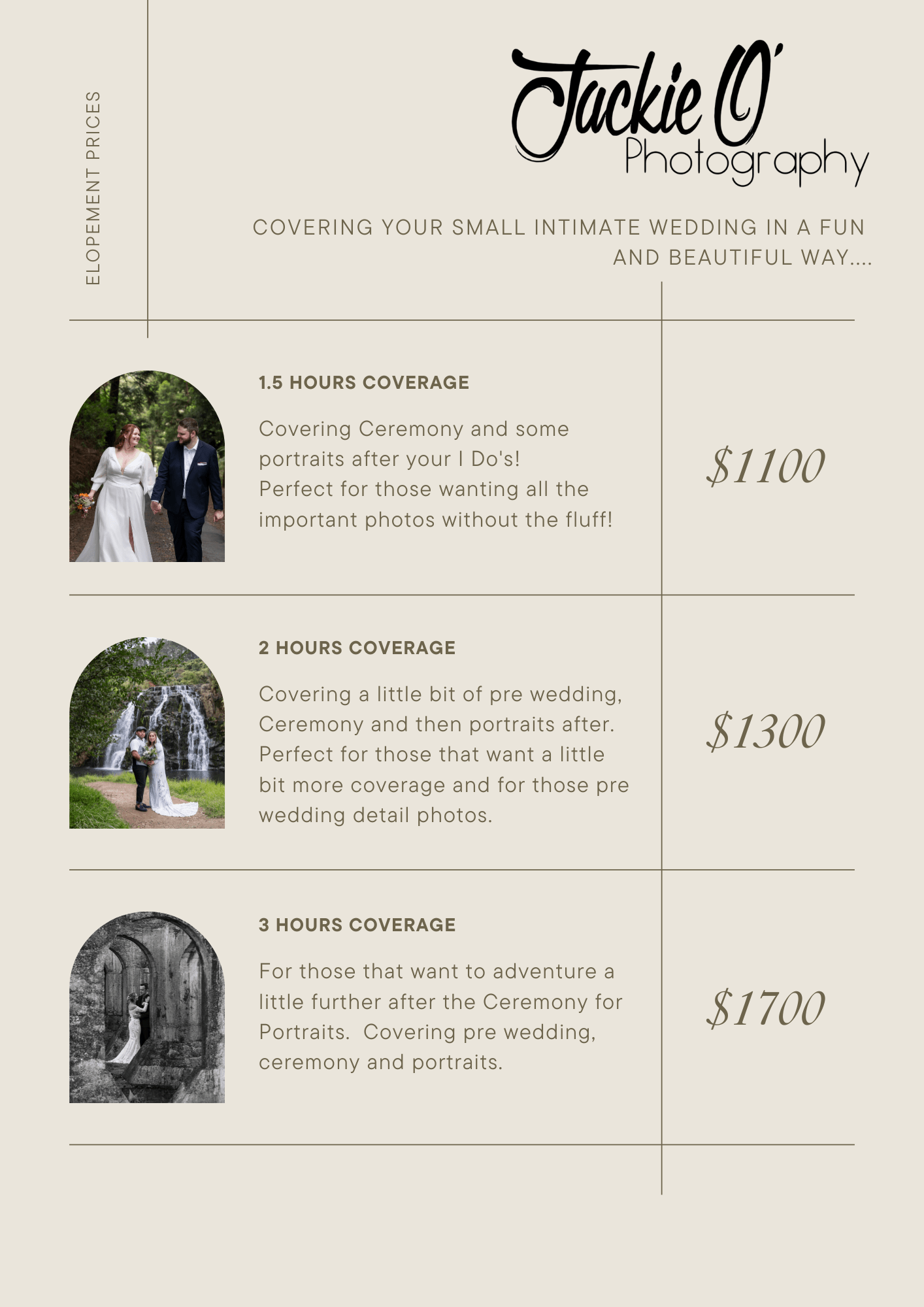 Sometimes all you want is the basics covered - The Ceremony and some beautiful photos to treasure of just the two of you! $1100 is for 1.5 hours - can custom a package to suit.